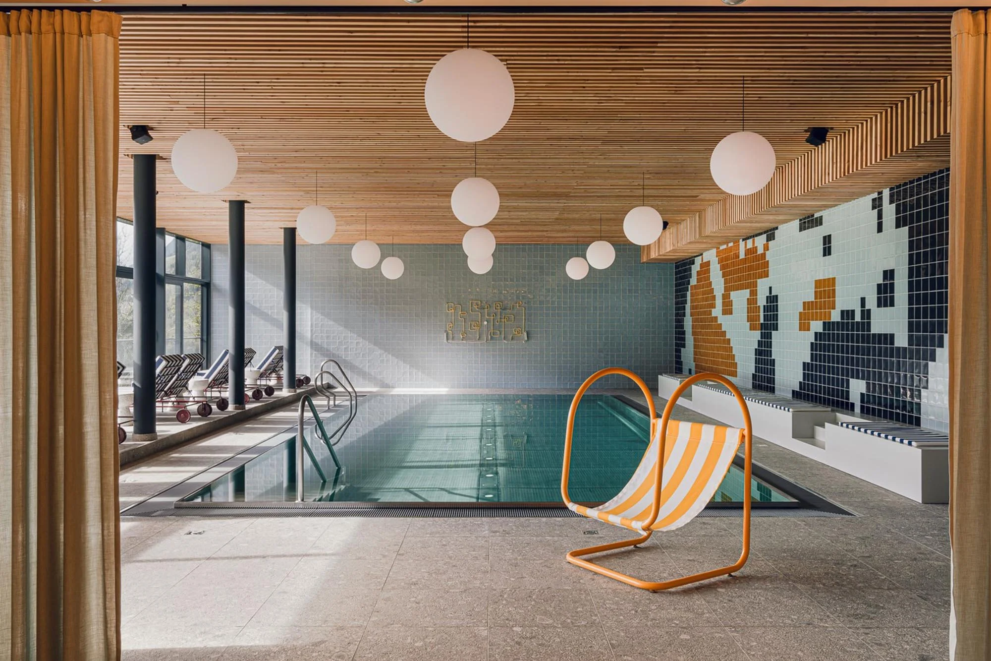 Facilities include two saunas and an indoor pool, designed as spaces for restoration rather than indulgence. The emphasis remains on calm, material warmth, and physical recovery — aligning wellness with environment rather than trend.